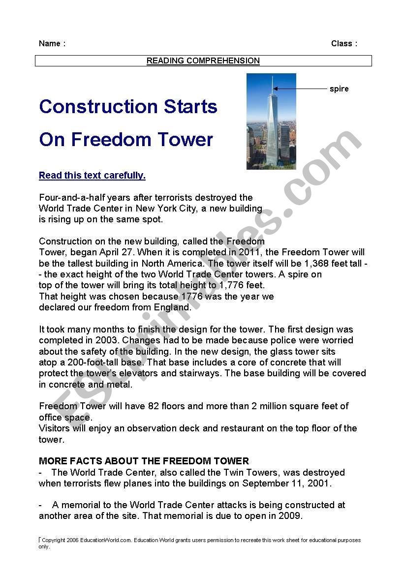 Reading After 9 11 The Freedom Tower In New York Text Comprehension Exercise right Or Wrong ESL Worksheet By Floam