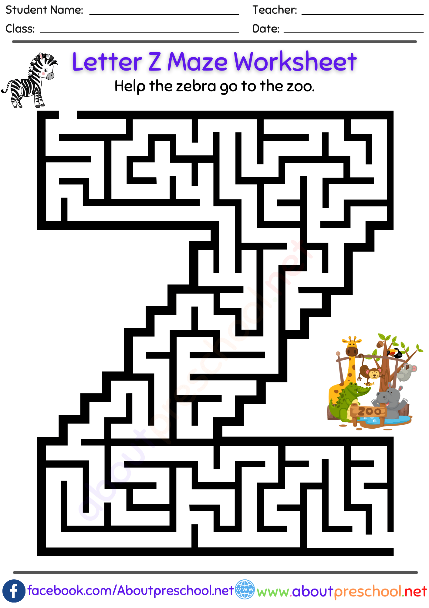 Free Letter Z Maze Worksheet About Preschool