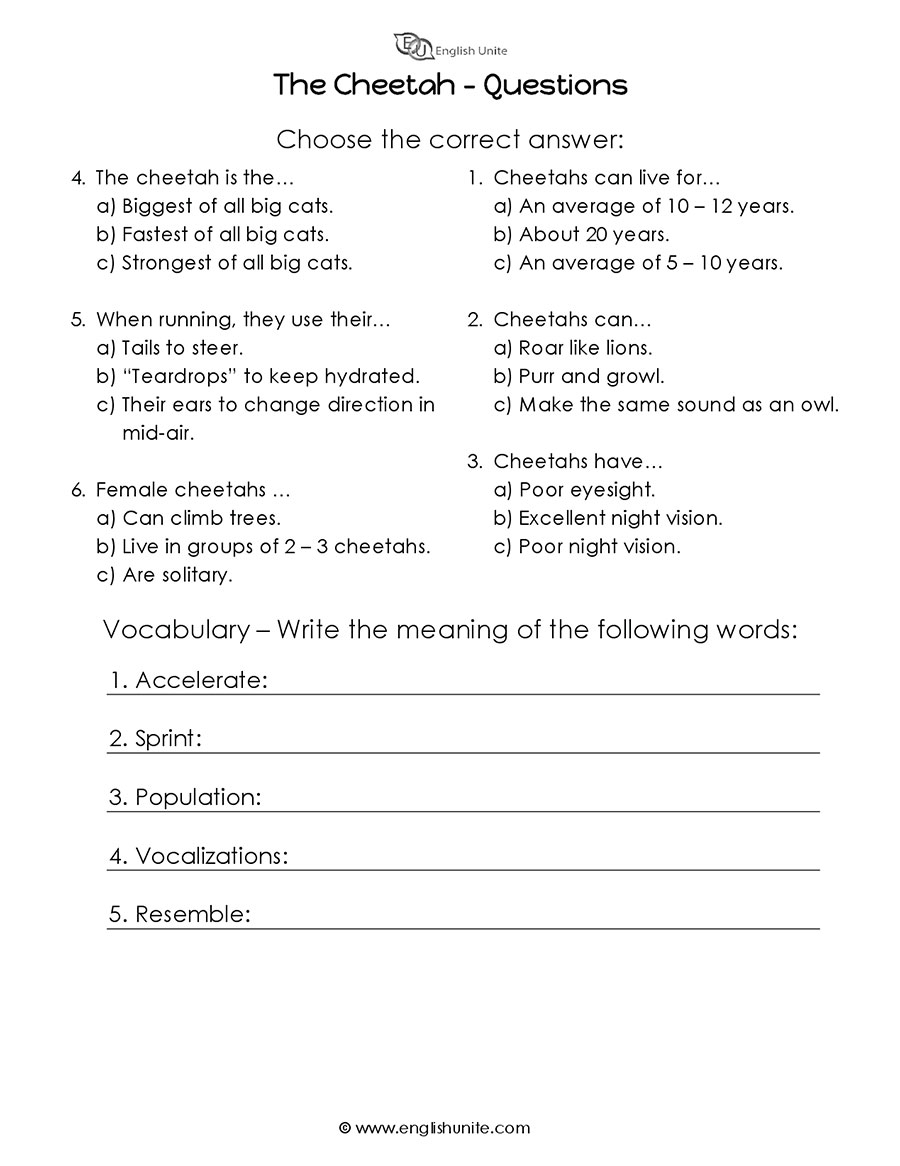 Additionally, cheetah reading comprehension worksheets can help your child build their vocabulary and expand their knowledge on different subjects. These worksheets are a great way to reinforce what your child has learned in school and help them retain information better.