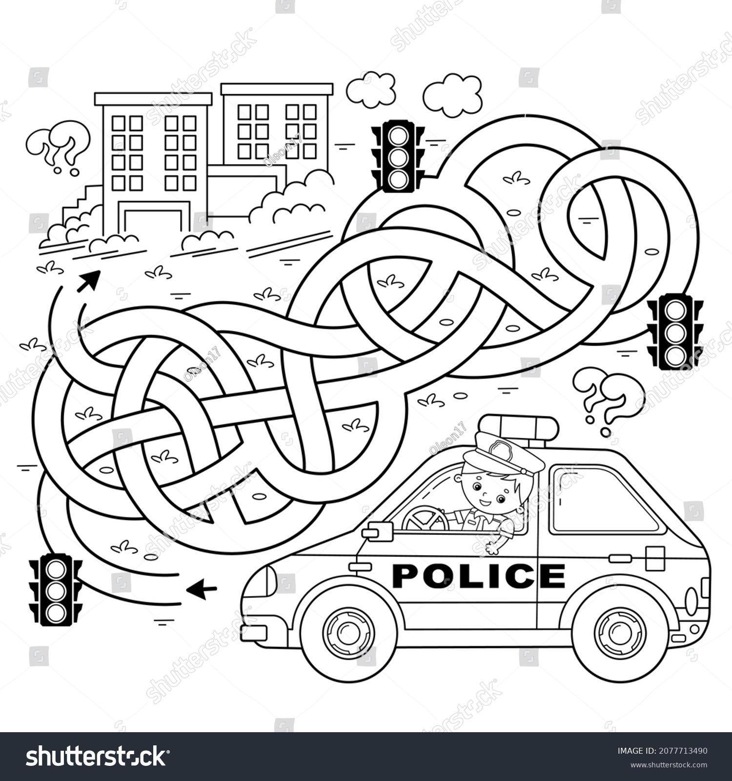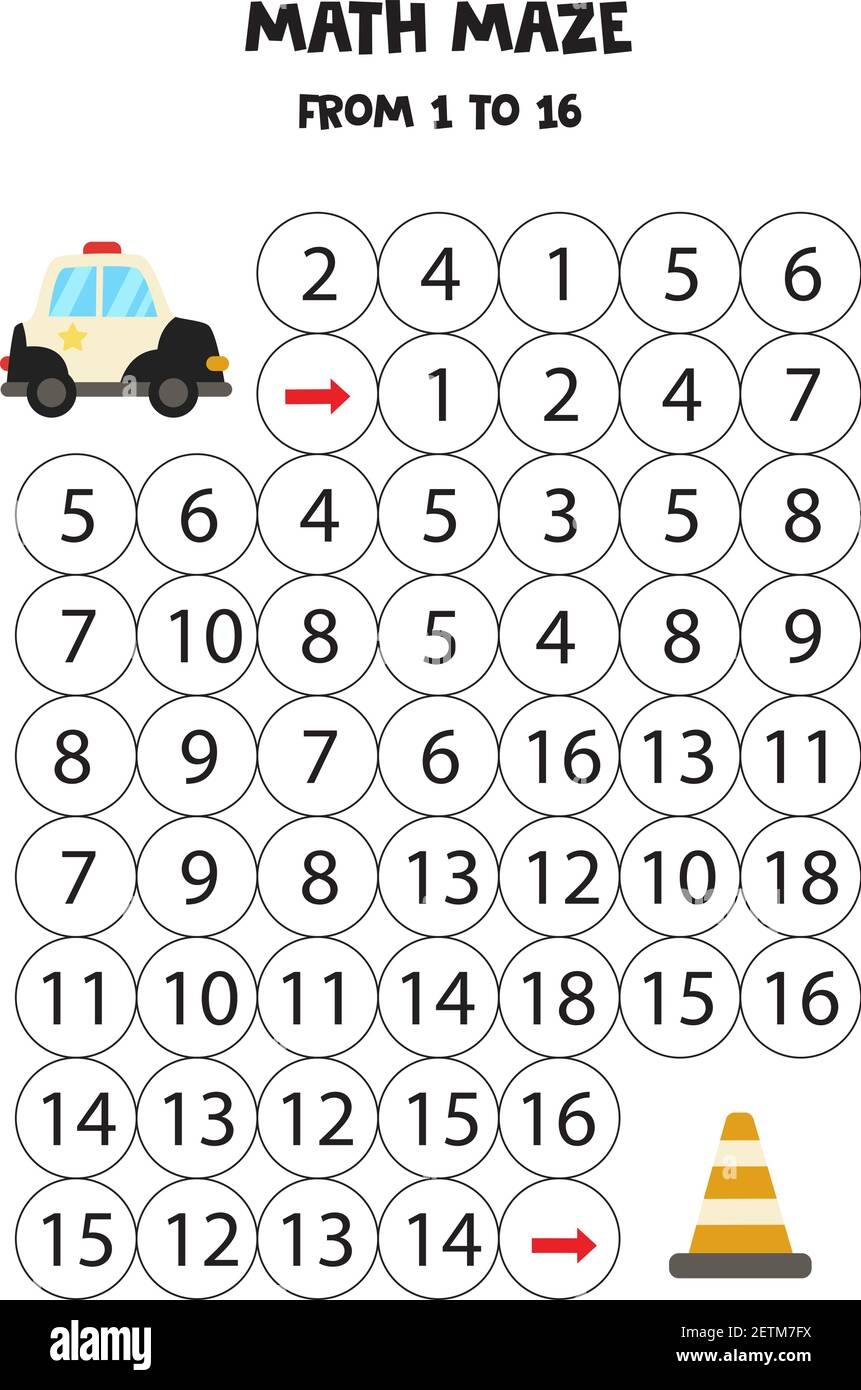 Math Maze With Police Car And Traffic Cone Count To 16 Printable