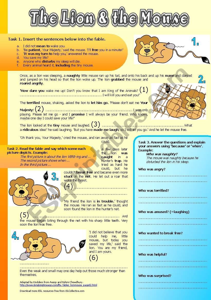 The Lion And The Mouse Fable Reading Comprehension Vocabulary Exercises W Solutions ESL Worksheet By Kisdobos
