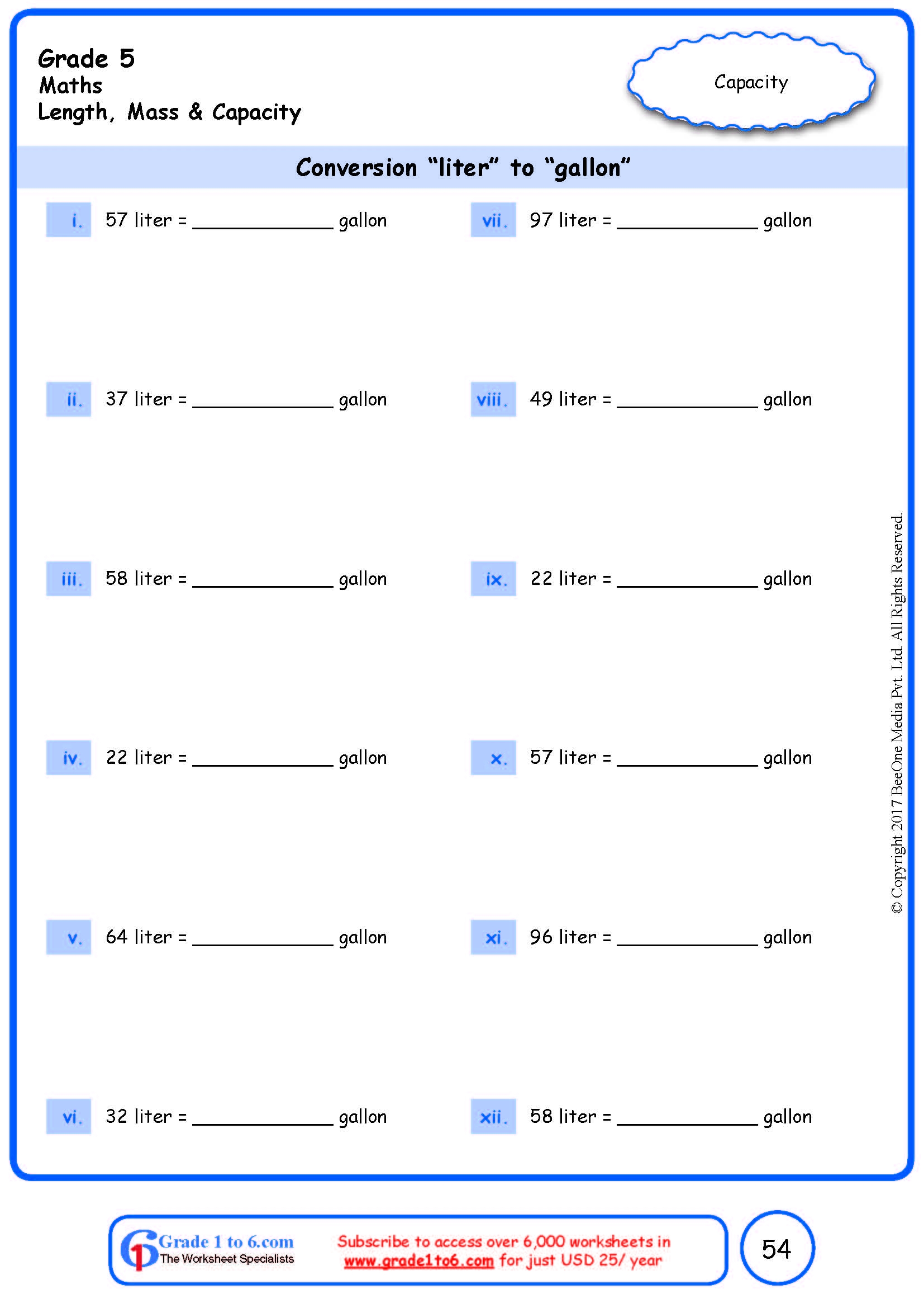 Grade 5 Conversion To Liter To Gallon Worksheets www grade1to6