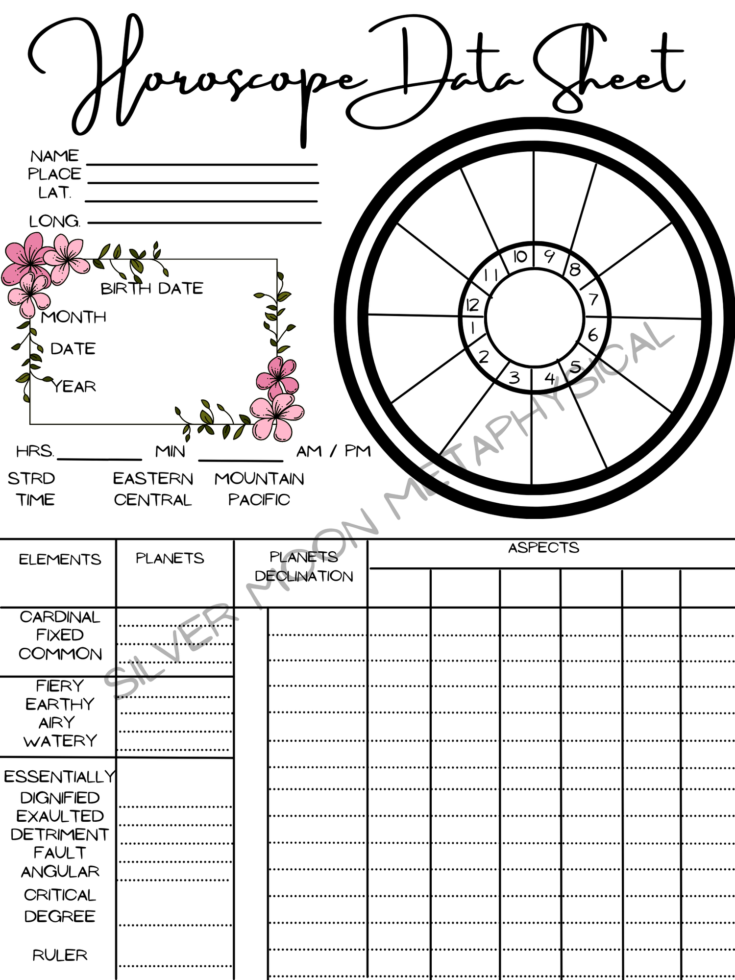Horoscope Data Worksheet For Book Of Shadows Grimoire Silver
