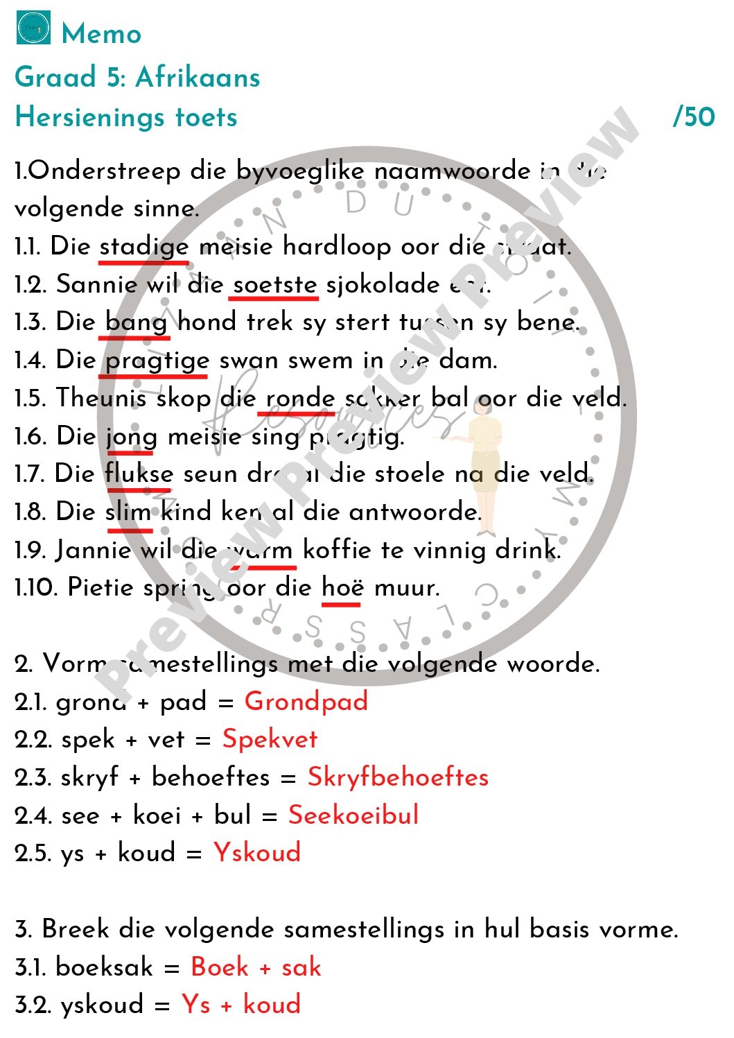 Afrikaans Grade 5 Hersienings Toets Teacha