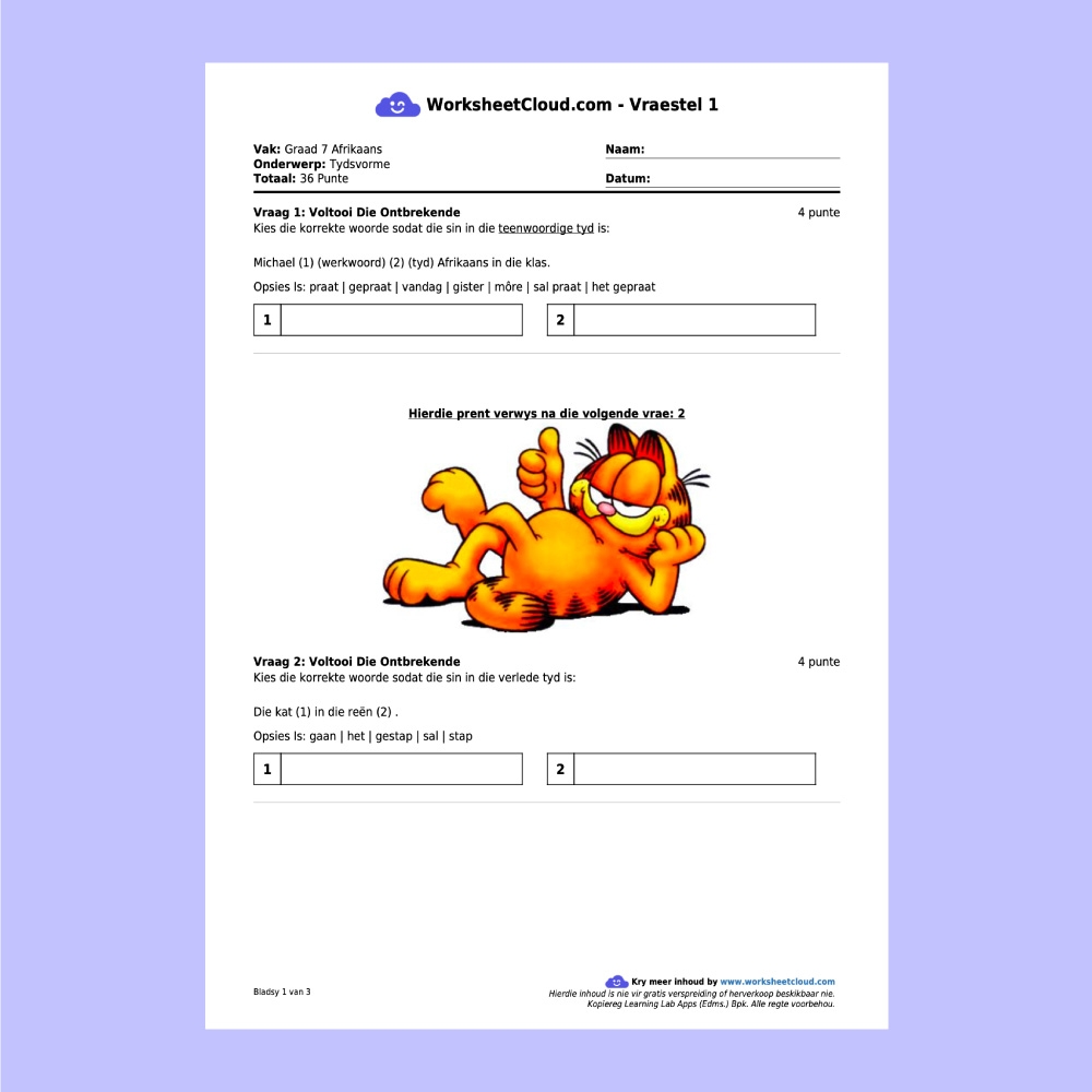 Grade 7 Afrikaans Pack WorksheetCloud