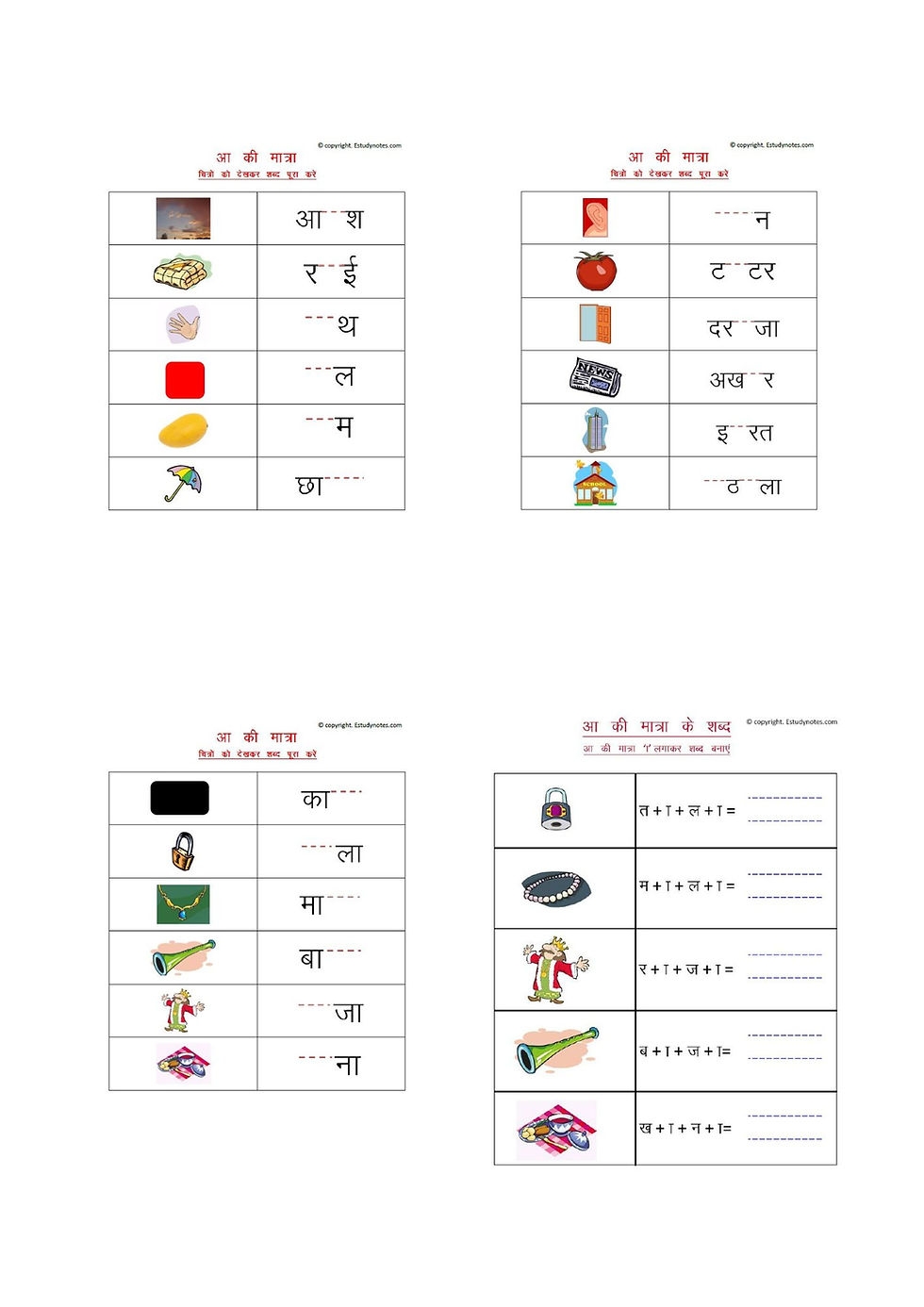 Grade 1 Hindi Worksheets Aa Ki Matra Estudynotes
