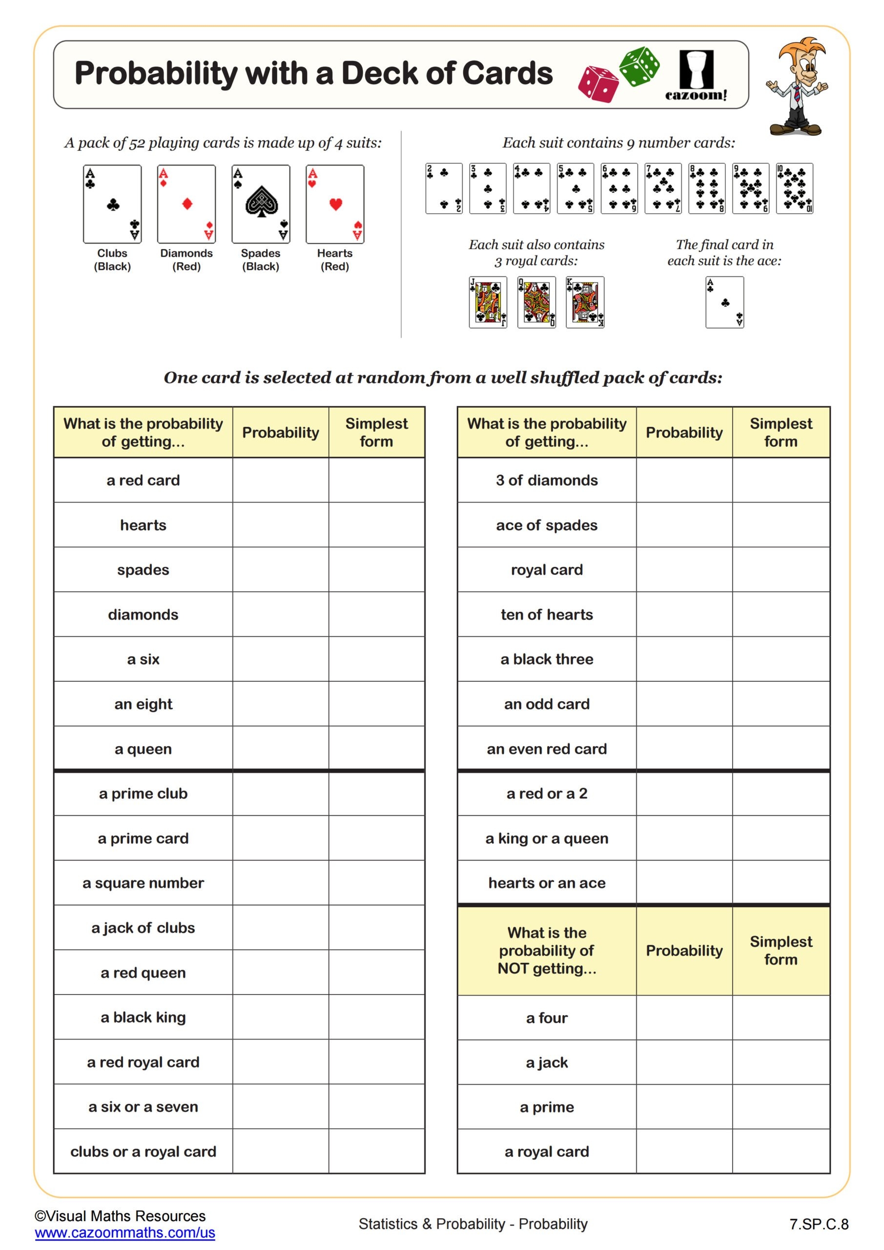 Probability With A Deck Of Cards Worksheet PDF Printable Statistics U0026 Probability Worksheet