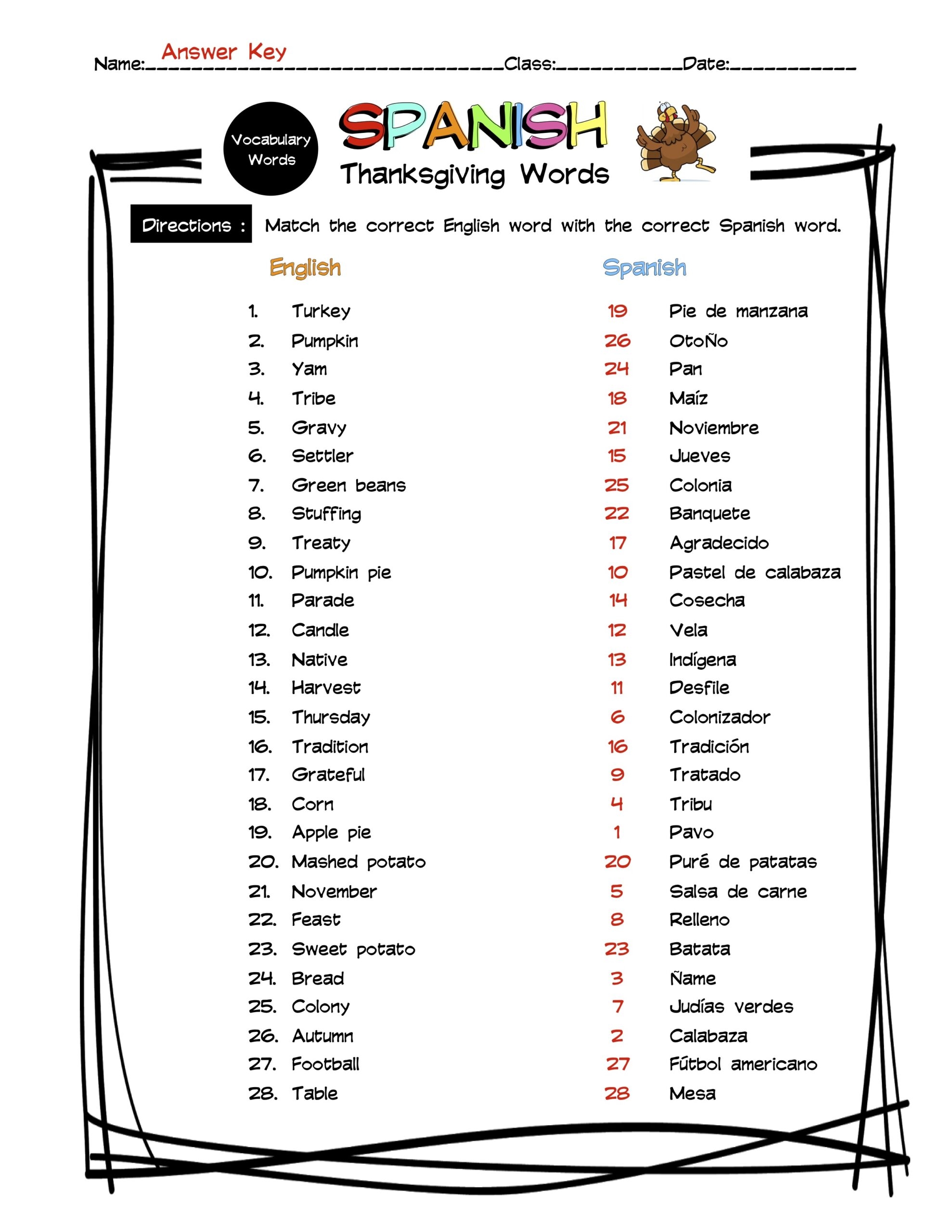 Spanish Thanksgiving Vocabulary Matching Worksheet U0026 Answer Key Made By Teachers