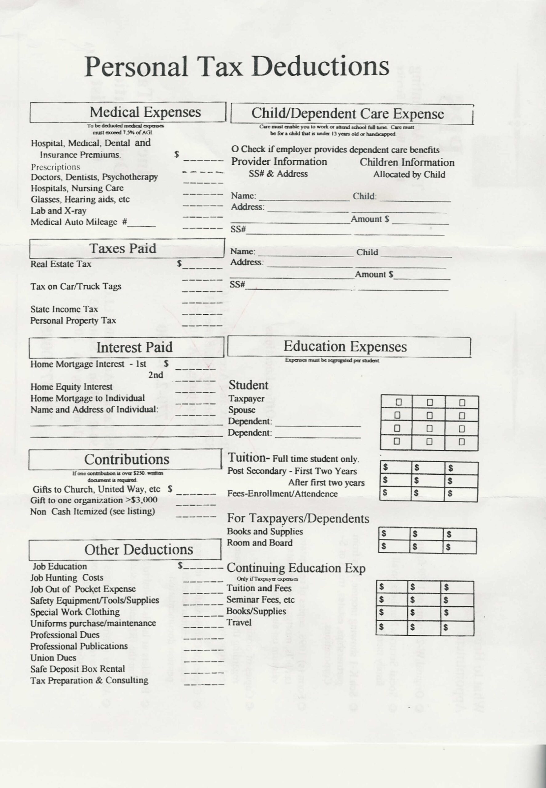 Free Printable Tax Deduction Worksheet