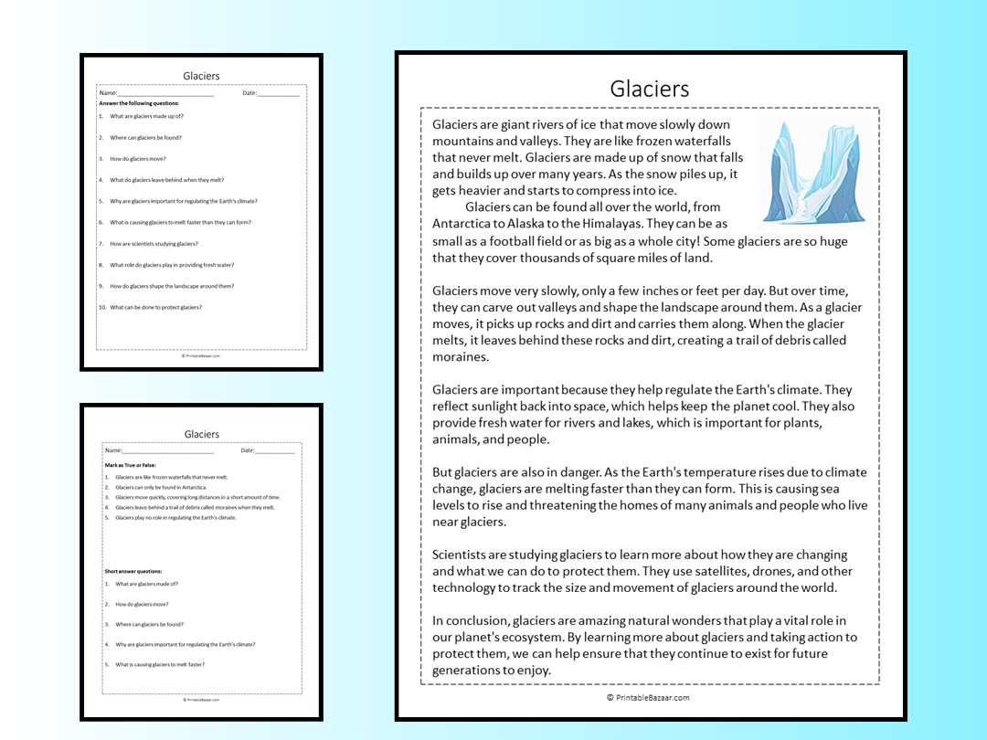 Glaciers Reading Comprehension Passage Printable Worksheet