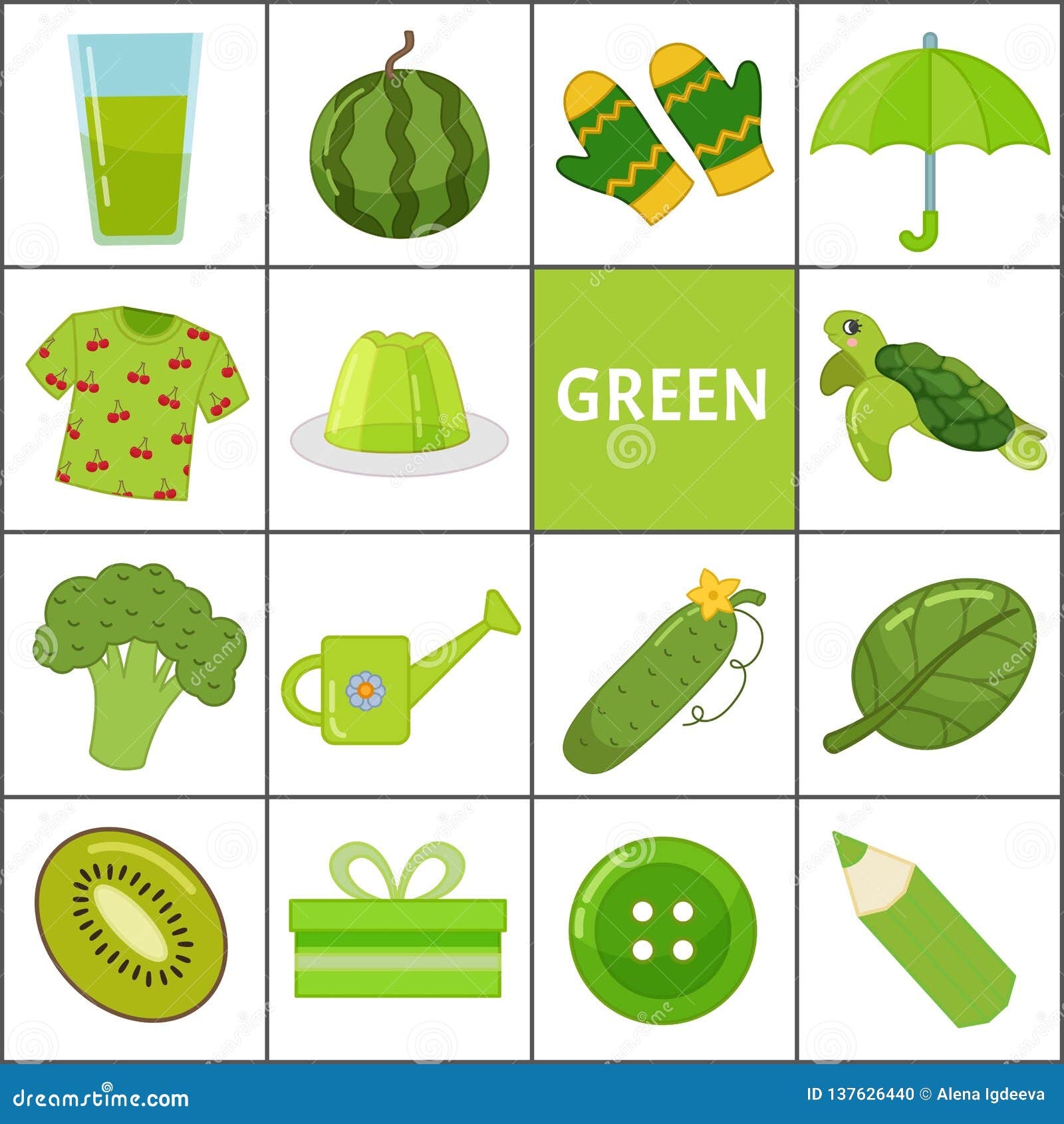 Colorful Set Of Green Color Objects Visual Dictionary For Children About The Basic Colors Cartoon Images To Learning In Kindergarten And Preschool Royalty Free SVG Cliparts Vectors And Stock Illustration Image 137246914