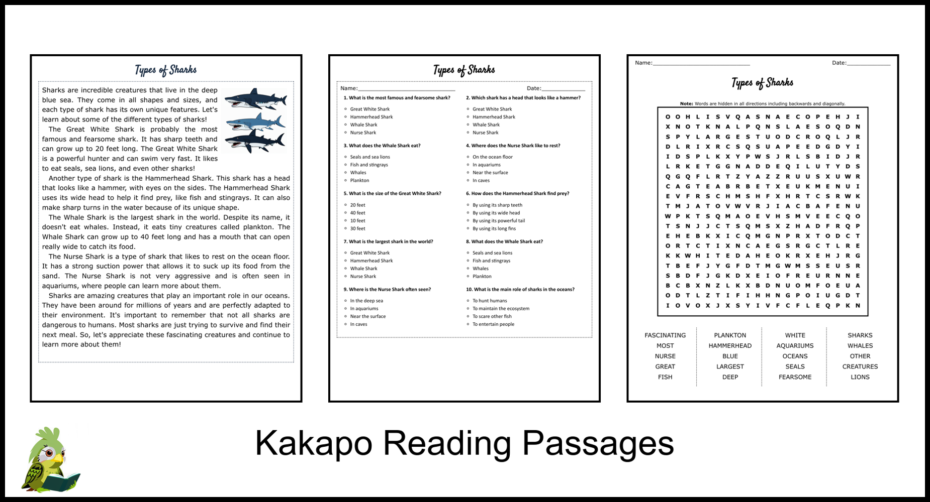 Types Of Sharks Reading Comprehension And Word Search Teaching Resources
