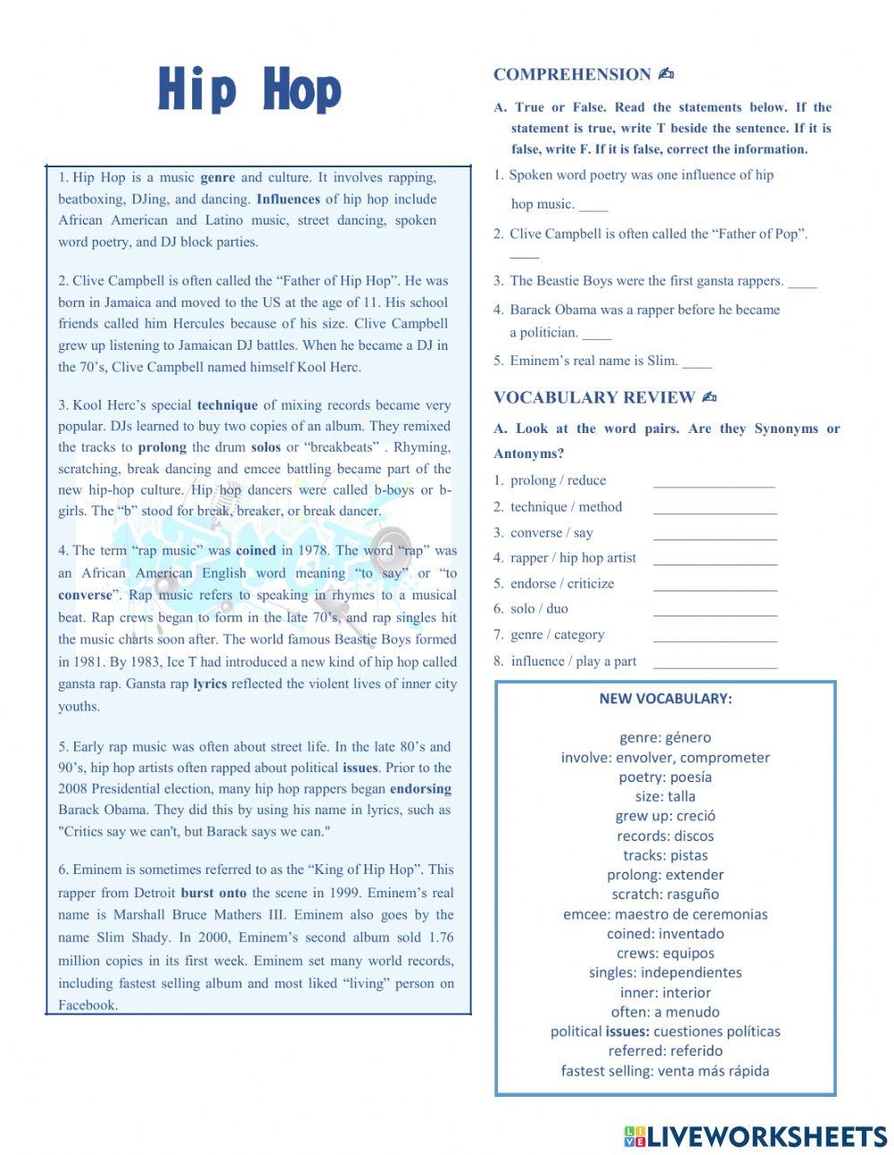 Hip Hop Reading Comprehension Worksheets Pdf