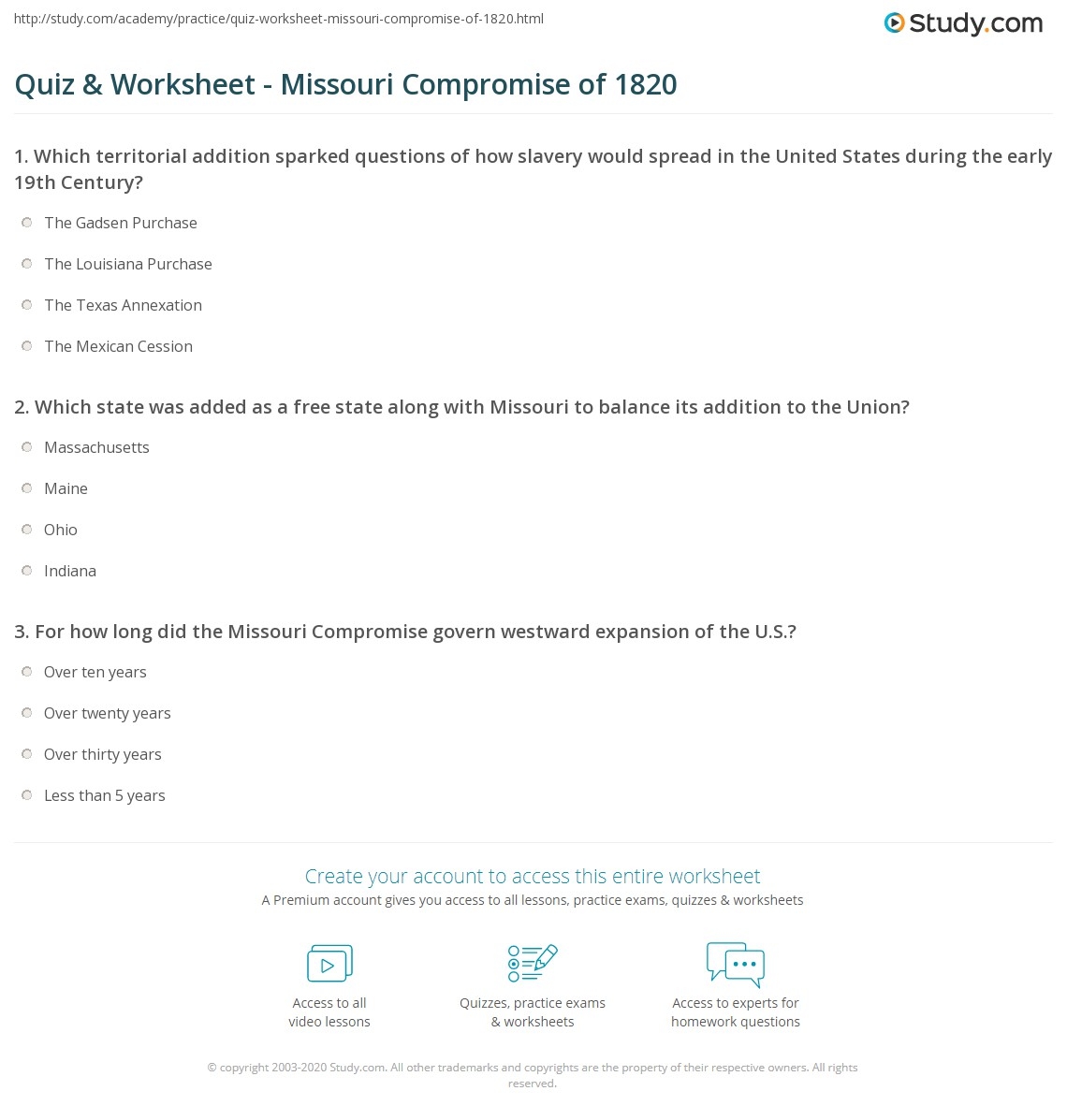 Quiz U0026 Worksheet Missouri Compromise Of 1820 Study