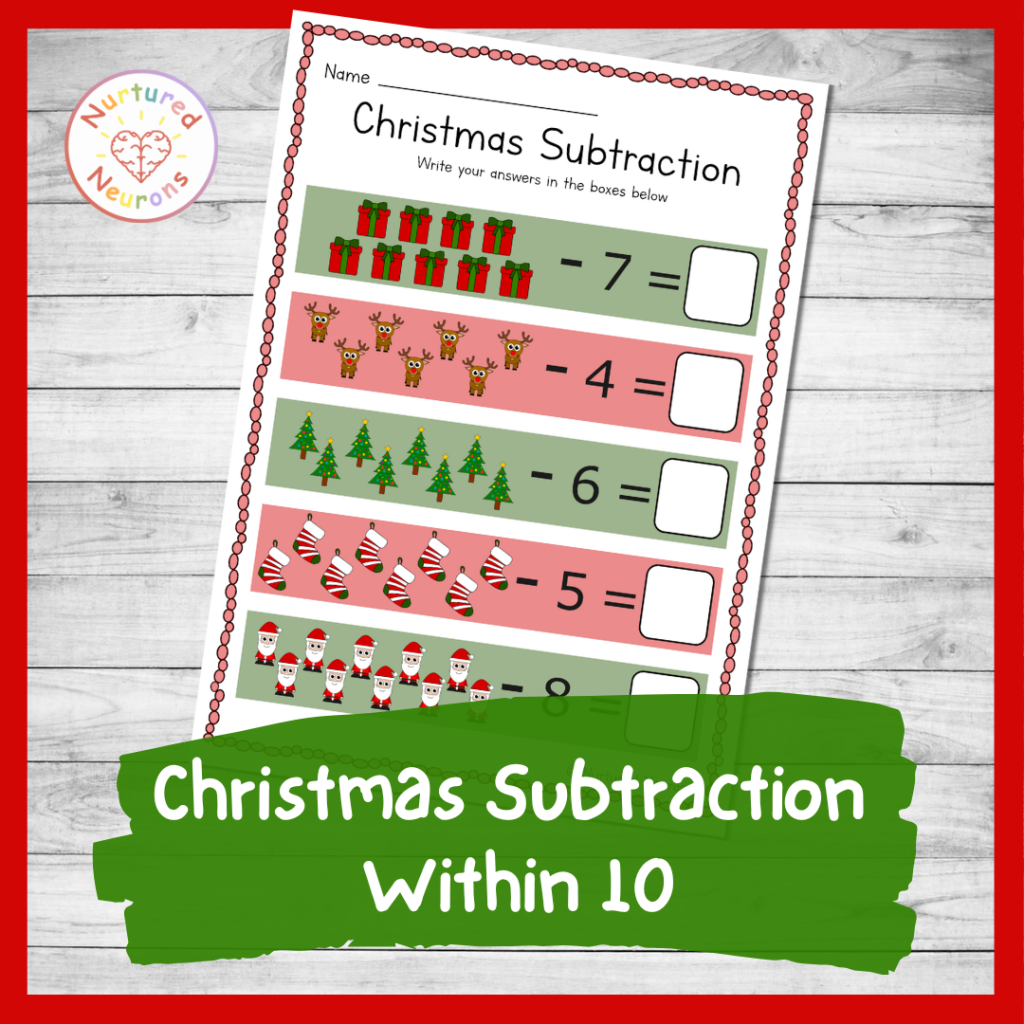 Christmas Subtraction Within 10 Worksheet Preschool And Kindergarten Math Printable Nurtured Neurons