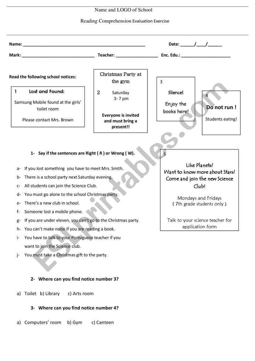 Reading Comprehension Evaluation Exercise On School Notices ESL Worksheet By Graceoli