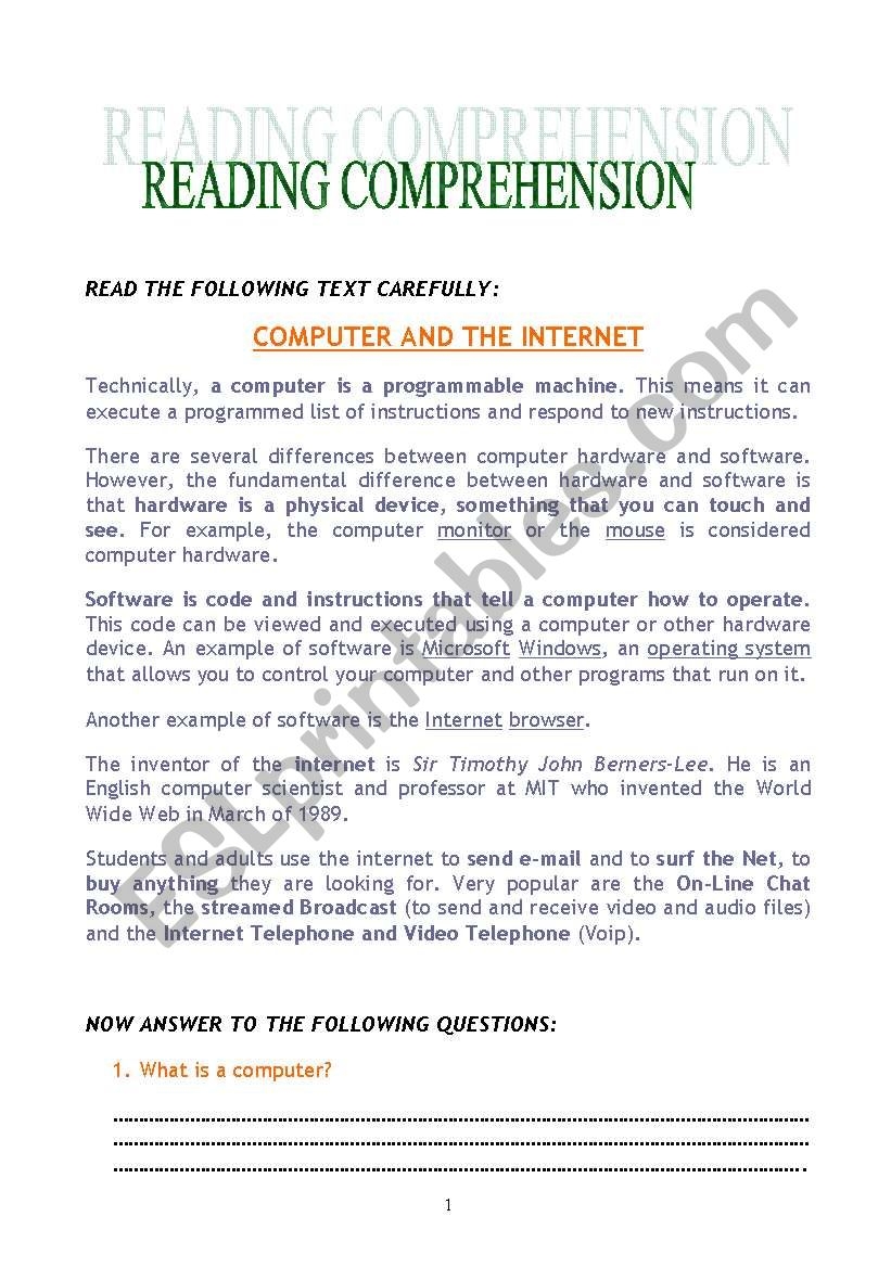Do you want to test your reading comprehension skills while learning about computers? Look no further! This reading comprehension worksheet will challenge and entertain you as you dive into the world of technology.
