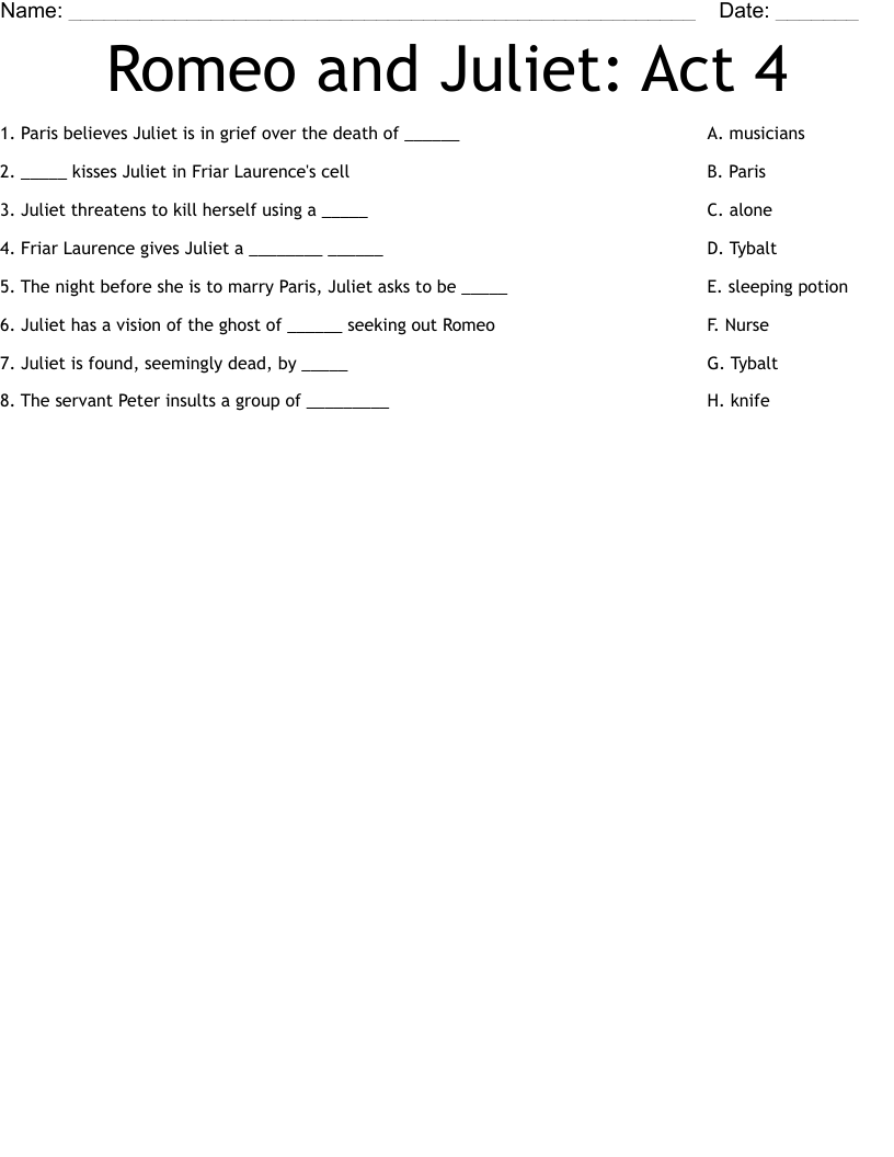 One common activity found in these worksheets is character analysis. Students are asked to delve into the personalities of Romeo, Juliet, and other key players in the play. By examining their actions and motivations, students can gain a deeper insight into the story.