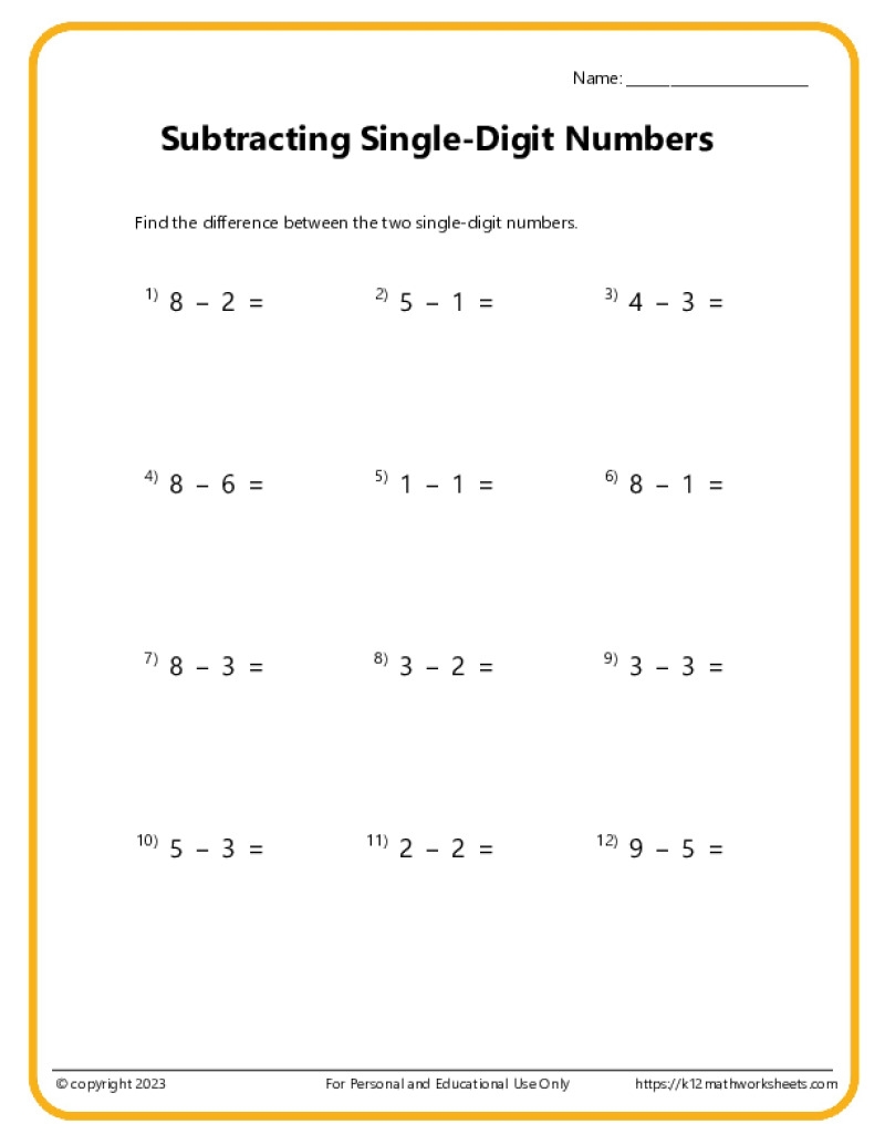 Single Digit Subtraction Worksheets K12 Math Worksheets