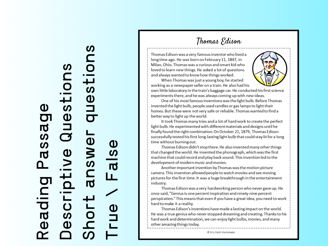 Thomas Edison was one of the most famous inventors in history, known for creating the light bulb and many other groundbreaking inventions. His life and work continue to inspire people of all ages, and one way to learn more about him is through a Thomas Edison reading comprehension worksheet PDF.