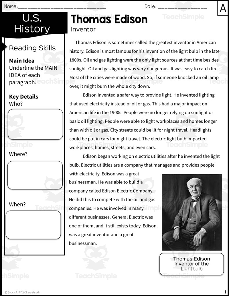 Thomas Edison Reading Comprehension Passage Printable Worksheet Teaching Resources